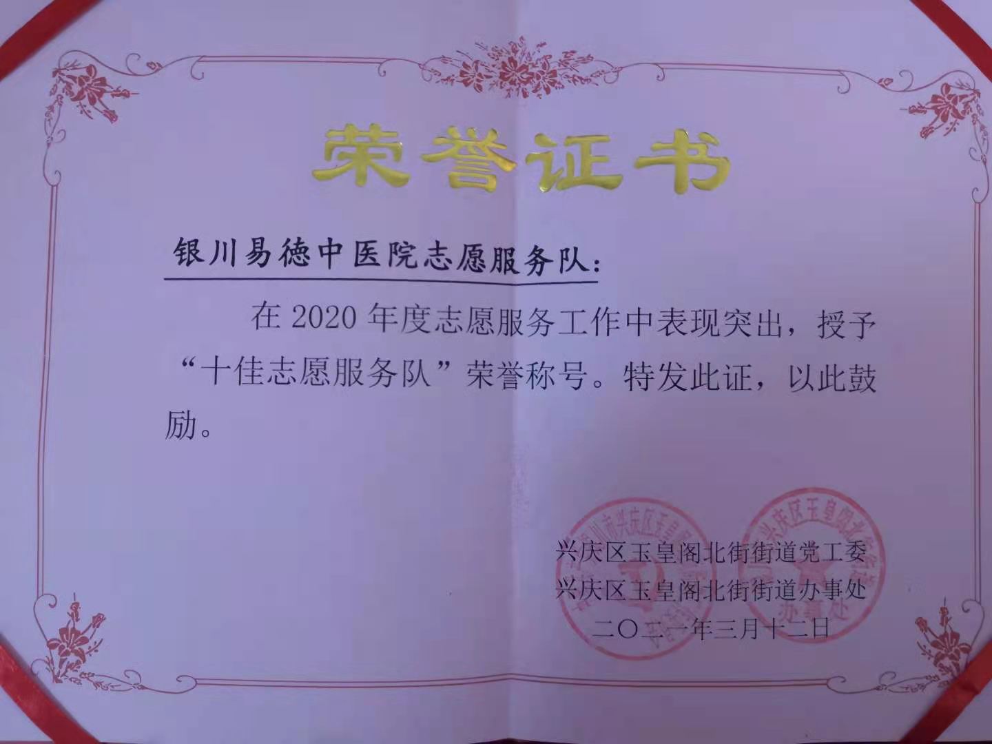 启动仪式上,党员志愿者共同重温入党誓词,用铿锵誓言喊出了党员志愿者的风采,活动现场还对优秀志愿服务项目、优秀志愿服务队、优秀志愿者进行了表彰。银川易德中医医院荣获“十佳志愿服务队”荣誉称号。